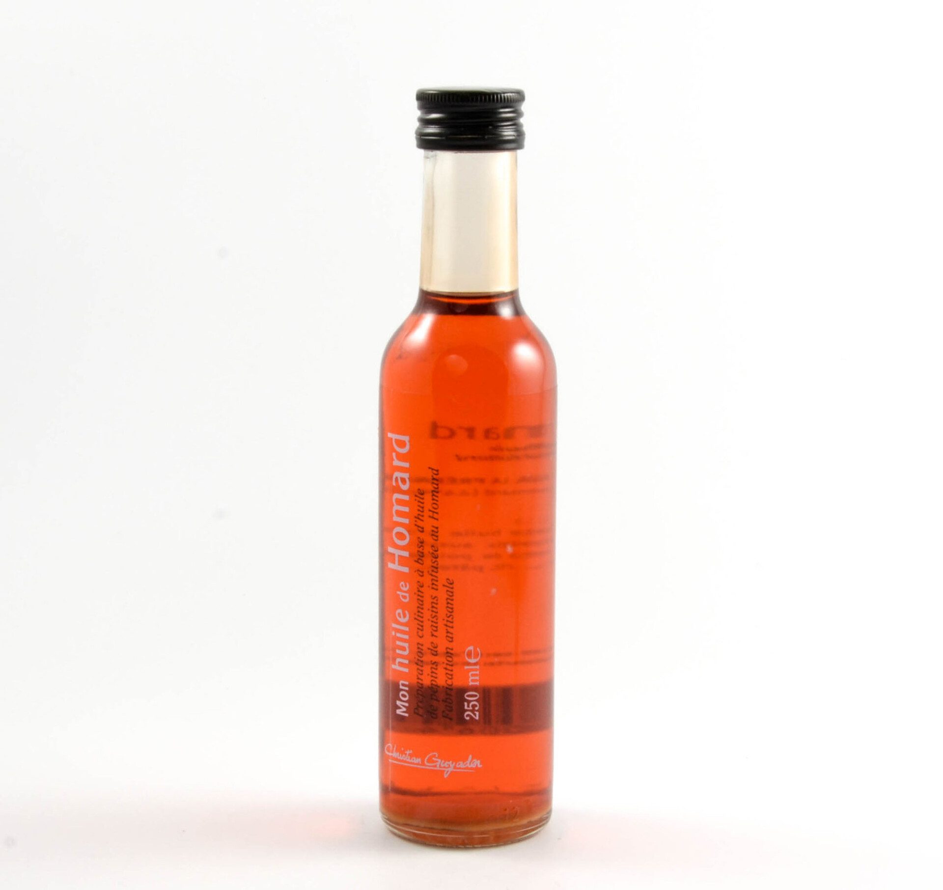 Cette Huile de Homard est élaborée à partir d’une huile de pépins de raisins dans laquelle sont infusées des carapaces de homards bleus cuisinés, les épices et les aromates. Utilisée en cuisson ou en assaisonnement, elle exhale un parfum iodé unique.